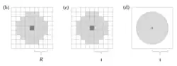 In Lenia's case, the neighborhood is instead a ball of radius centered on a site, , which may include the original site itself.