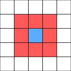 Mathematically, neighborhoods like those in Game of Life may be represented using a set of position vectors in . For the classic Moore neighborhood used by Game of Life, for instance, ; i.e. a square of size 3 centered on every site.