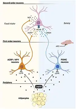 Leptin binds to neuropeptide Y (NPY) neurons in the arcuate nucleus in such a way as to decrease the activity of these neurons. Leptin signals to the hypothalamus which produces a feeling of satiety. Moreover, leptin signals may make it easier for people to resist the temptation of foods high in calories.[44]
