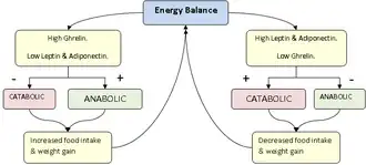 Thus, a lesion in the lateral hypothalamus causes anorexia (due to a lack of hunger signals) and a lesion in the medial hypothalamus causes excessive hunger (due to a lack of satiety signals).[33] This appetite inhibition is long-term, in contrast to the rapid inhibition of hunger by cholecystokinin (CCK) and the slower suppression of hunger between meals mediated by PYY3-36. The absence of leptin (or its receptor) leads to uncontrolled hunger and resulting obesity. Fasting or following a very-low-calorie diet lowers leptin levels.[36][37][38][39] Leptin levels change more when food intake decreases than when it increases.[40] The dynamics of leptin due to an acute change in energy balance may be related to appetite and eventually, to food intake rather than fat stores.[41][42]
