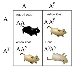 Lethal alleles were first discovered by Lucien Cuénot in 1905 while studying the inheritance of coat colour in mice. The agouti gene in mice is largely responsible for determining coat colour. The wild-type allele produces a blend of yellow and black pigmentation in each hair of the mouse. This yellow and black blend may be referred to as 'agouti' in colour.[3] One of the mutant alleles of the agouti gene results in mice with a much lighter, yellowish colour. When these yellow mice were crossed with homozygous wild-type mice, a 1:1 ratio of yellow and dark grey offspring were obtained. This indicated that the yellow mutation is dominant, and all the parental yellow mice were heterozygotes for the mutant allele.