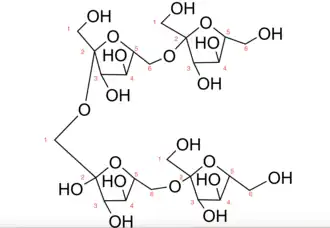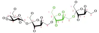 Levan is a naturally occurring fructan present in many plants and microorganisms.[1] This polymer is made up of fructose, a monosaccharide sugar, connected by 2,6 beta glycosidic linkages. Levan can have both branched and linear structures of relatively low molecular weight.[2] Branched levan forms a very small, sphere-like structure[3] with basal chains 9 units long. The 2,1 branching allows methyl ethers to form and create a spherical shape. The ends of levan also tend to contain a glucosyl residue.[4] Branched levan tends to be more stable than linear polysaccharides.[5] However, the amount of branching and length of polymerization tends to vary among different species.[4] The shortest levan is 6-kestose, a chain of two fructose molecules and a terminal glucose molecule.