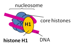 In molecular biology, the linker histone H1 is a protein family forming a critical component of eukaryotic chromatin. H1 histones bind to the linker DNA exiting from the nucleosome core particle, while the core histones (H2A, H2B, H3 and H4) form the octamer core of the nucleosome around which the DNA is wrapped.[1]