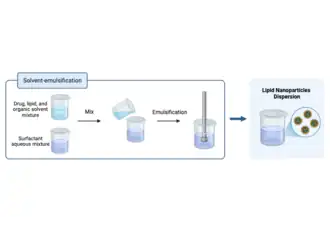 Different formulation procedures include high shear homogenization and ultrasound, solvent emulsification/evaporation, or microemulsion. Obtaining size distributions in the range of 30-180 nm is possible using ultrasonication at the cost of long sonication time. Solvent-emulsification is suitable in preparing small, homogeneously sized lipid nanoparticles dispersions with the advantage of avoiding heat.[15]