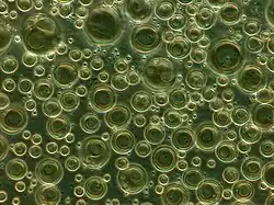Various types of phosphatidylcholine liposomes in suspension. Method of phase-contrast microscopy (1000-fold magnification). The following types of liposomes are visible: small monolamellar vesicles, large monolamellar vesicles, multilamellar vesicles, oligolamellar vesicles.