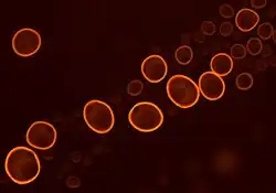 A micrograph of phosphatidylcholine liposomes, which were stained with fluorochrome acridine orange. Method of fluorescence microscopy (1250-fold magnification).