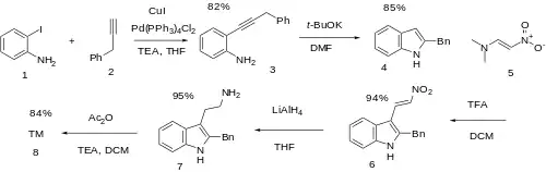 - ↑ Righi, Marika; Topi, Francesca; Bartolucci, Silvia; Bedini, Annalida; Piersanti, Giovanni; Spadoni, Gilberto (2012). "Synthesis of Tryptamine Derivatives via a Direct, One-Pot Reductive Alkylation of Indoles". The Journal of Organic Chemistry. 77 (14): 6351–6357. doi:10.1021/jo3010028.