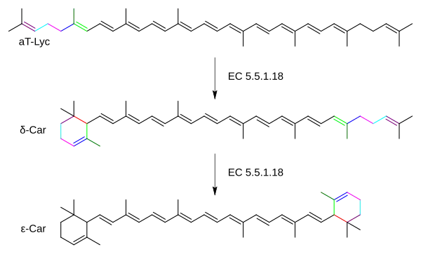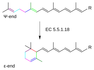- ↑ Cunningham FX, Gantt E (February 2001). "One ring or two? Determination of ring number in carotenoids by lycopene epsilon-cyclases". Proceedings of the National Academy of Sciences of the United States of America. 98 (5): 2905–10. doi:10.1073/pnas.051618398. PMC 30238. PMID 11226339.
