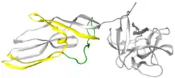 Lysenin is a protein produced in the coelomocyte-leucocytes of the earthworm Eisenia fetida.[2] This protein was first isolated from the coelomic fluid in 1996 and named lysenin (from lysis and Eisenia).[3] Lysenin is a relatively small water-soluble molecule with a molecular weight of 33 kDa. Using X-ray crystallography, lysenin was classified as a member of the Aerolysin protein family by structure and function.[4] Structurally, each lysenin monomer consists of a receptor binding domain (grey globular part on right of Figure 1) and a Pore Forming Module (PFM); domains shared throughout the aerolysin family.[4] The lysenin receptor binding domain shows three sphingomyelin binding motifs. The Pore Forming Module contains the regions that undergo large conformational changes to become the β-barrel in the pore.[5]