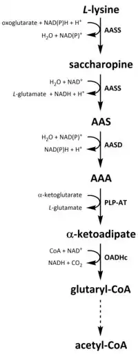 As with all amino acids, catabolism of lysine is initiated from the uptake of dietary lysine or from the breakdown of intracellular protein. Catabolism is also used as a means to control the intracellular concentration of free lysine and maintain a steady-state to prevent the toxic effects of excessive free lysine.[35] There are several pathways involved in lysine catabolism but the most commonly used is the saccharopine pathway, which primarily takes place in the liver (and equivalent organs) in animals, specifically within the mitochondria.[36][35][37][38] This is the reverse of the previously described AAA pathway.[36][39] In animals and plants, the first two steps of the saccharopine pathway are catalysed by the bifunctional enzyme, α-aminoadipic semialdehyde synthase (AASS), which possess both lysine-ketoglutarate reductase (LKR) (E.C 1.5.1.8) and SDH activities, whereas in other organisms, such as bacteria and fungi, both of these enzymes are encoded by separate genes.[40][41] The first step involves the LKR catalysed reduction of L-lysine in the presence of α-ketoglutarate to produce saccharopine, with NAD(P)H acting as a proton donor.[42] Saccharopine then undergoes a dehydration reaction, catalysed by SDH in the presence of NAD+, to produce AAS and glutamate.[43] AAS dehydrogenase (AASD) (E.C 1.2.1.31) then further dehydrates the molecule into AAA.[42] Subsequently, PLP-AT catalyses the reverse reaction to that of the AAA biosynthesis pathway, resulting in AAA being converted to α-ketoadipate. The product, α‑ketoadipate, is decarboxylated in the presence of NAD+ and coenzyme A to yield glutaryl-CoA, however the enzyme involved in this is yet to be fully elucidated.[44][45] Some evidence suggests that the 2-oxoadipate dehydrogenase complex (OADHc), which is structurally homologous to the E1 subunit of the oxoglutarate dehydrogenase complex (OGDHc) (E.C 1.2.4.2), is responsible for the decarboxylation reaction.[44][46] Finally, glutaryl-CoA is oxidatively decarboxylated to crotonyl-CoA by glutaryl-CoA dehydrogenase (E.C 1.3.8.6), which goes on to be further processed through multiple enzymatic steps to yield acetyl-CoA; an essential carbon metabolite involved in the tricarboxylic acid cycle (TCA).[42][47][48][49]