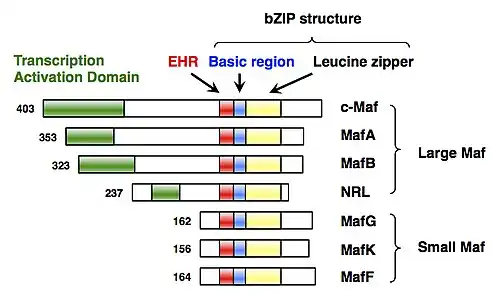 MafF has a bZIP structure that consists of a basic region for DNA binding and a leucine zipper structure for dimer formation.[5] Similar to other sMafs, MafF lacks any canonical transcriptional activation domains.[5]