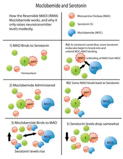 - ↑ Nair NP, Ahmed SK, Kin NM (November 1993). "Biochemistry and pharmacology of reversible inhibitors of MAO-A agents: focus on moclobemide". Journal of Psychiatry & Neuroscience. 18 (5): 214–25. PMC 1188542. PMID 7905288.