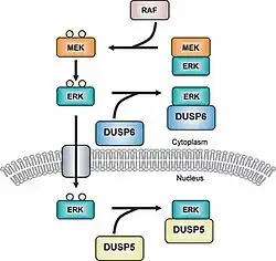 - ↑ Caunt, Christopher J.; Keyse, Stephen M. (January 2013). "Dual-specificity MAP kinase phosphatases (MKPs)". FEBS Journal. 280 (2): 489–504. doi:10.1111/j.1742-4658.2012.08716.x. PMC 3594966. PMID 22812510.