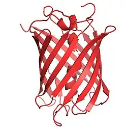 The gene for mCherry is 711bp long,[4] and the protein is made up of 236 residues with a mass of 26.722 kDa.[5] The crystal structure of mCherry was determined in 2006.[6] It contains 3 alpha helices and 13 beta sheets which make up the beta barrel. The chromophore in mCherry is made up of three amino acids, methionine, tyrosine, and glycine, which are post-translationally modified into an imidazolinone.[1] The number of these residues in sequence are 71, 72, and 73 respectively. The extended pi-electron conjugation gives mCherry its red-shifted absorbance and emission.[7] The chromophore forms from a central helix which is shielded from solvent in an 11-stranded beta barrel.[7] This structure is almost identical to the tertiary structure of DsRed which also has an 11-stranded beta barrel, and is similar to GFPs tertiary structure.[8] This makes the environment around the chromophore in mCherry more hydrophobic than the environment around the chromophore of DsRed.[9] The end termini on mCherry are GFP-like, which allows it to be incorporated in to systems where GFP can be used and mRFP1 could not have been used.[1]