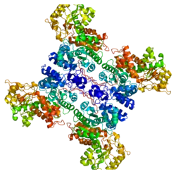 NAD-dependent malic enzyme, mitochondrial is a protein that in humans is encoded by the ME2 gene.[4][5] This gene encodes a mitochondrial NAD-dependent malic enzyme, a homotetrameric protein, that catalyzes the oxidative decarboxylation of malate to pyruvate. It had previously been weakly linked to a syndrome known as Friedreich ataxia that has since been shown to be the result of mutation in a completely different gene.[5]