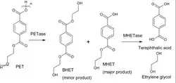 The enzyme MHETase is a hydrolase, which was discovered in 2016. It cleaves 2-hydroxyethyl terephthalic acid, the PET degradation product by PETase, to ethylene glycol and terephthalic acid.[1] This pair of enzymes, PETase and MHETase, enable the bacterium Ideonella sakaiensis to live on the plastic PET as sole carbon source.