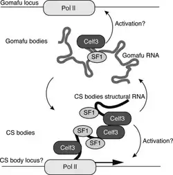 - ↑ Sone M, Hayashi T, Tarui H, Agata K, Takeichi M, Nakagawa S (August 2007). "The mRNA-like noncoding RNA Gomafu constitutes a novel nuclear domain in a subset of neurons". Journal of Cell Science. 120 (Pt 15): 2498–2506. doi:10.1242/jcs.009357. PMID 17623775. S2CID 11790043.