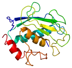 Neutrophil collagenase, also known as matrix metalloproteinase-8 (MMP-8) or PMNL collagenase (MNL-CL), is a collagen cleaving enzyme which is present in the connective tissue of most mammals.[5] In humans, the MMP-8 protein is encoded by the MMP8 gene.[6][7] The gene is part of a cluster of MMP genes which localize to chromosome 11q22.3.[5] Most MMP's are secreted as inactive proproteins which are activated when cleaved by extracellular proteinases. However, the enzyme encoded by this gene is stored in secondary granules within neutrophils and is activated by autolytic cleavage.