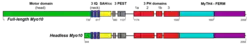 The native full-length Myo10 heavy chain can exist as a monomer with 3 calmodulin/calmodulin-like light chains or as an antiparallel dimer with 6 calmodulin/calmodulin-like light chains. An antiparallel Myo10 dimer with all 6 light chains would thus have 8 subunits and a native MW of ~574 kDa. Importantly, the tail in a Myo10 monomer can fold back onto the head to inhibit the head's motor activity.[29] Increases in plasma membrane PI(3,4,5)P3 levels are hypothesized to recruit Myo10 monomers to the plasma membrane via their PH domains, activating their motor activity and increasing their local concentration, leading to the formation of active antiparallel dimers that are capable moving along actin filaments. Myo10, like all known myosins other than Myo6, moves towards the barbed end of the actin filament.[34] Myo10 is capable of hydrolyzing ~10-20 ATP/s per head and has been reported to generate movement at rates of ~300-1500 nm/s.[23][27] Single-molecule studies show that native Myo10 dimers can take steps of up to ~55 nm, which are among the largest steps reported for a motor protein.[27] Myo10's large step size is due in part to the long lever arm formed by its neck domain and stable alpha helix, and in part due to the remarkably large swing of ~120° the Myo10 lever arm undergoes during its power stroke.[27] There is much interest in the mechanisms that target Myo10 to filopodial actin bundles, and in Myo10's ability to step from one actin filament in a bundle to another.[35][27][36] In addition to the full-length Myo10 described above, the use of alternative transcription start sites located in intron 19-20 of the full-length transcript results in the production of "headless" Myo10 transcripts that lack most of the myosin head domain, but include the rest of the Myo10 heavy chain.[37][38][39] The major headless transcripts in human are predicted to include exons 20-41 of full-length MYO10 and initiation of translation at M644 would result in a 1415 amino acid headless protein with a predicted MW of ~163 kDa that would be identical to amino acids 644-2058 of full-length MYO10.[37] Because headless Myo10 lacks most of the head domain, it lacks motor activity, but it retains all of Myo10's other domains and is thus expected to retain the ability to bind to light chains of the calmodulin superfamily, to membranes containing PI(3,4,5)P3 or PI(4,5)P3, to microtubules, and to proteins that bind the Myo10 tail such as DCC, neogenin, and β-integrins. Headless Myo10 has been hypothesized to act as a scaffolding protein for its various binding partners and/or as a "natural" dominant negative that can inhibit the actions of full-length Myo10.[37][38]