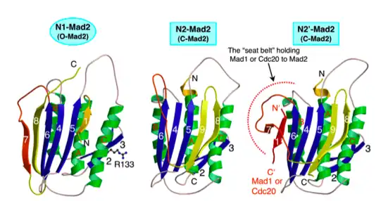 Mad2 is capable of forming multimers and adopts at least two structural conformations. Open Mad2 differs from closed Mad2 in the positioning of the 50 residue C-terminal segment. This “safety belt” is held tightly against the right side of the protein in the open conformation. Upon loosening, the safety belt can be re-positioned around a binding partner. In the closed conformation, the safety belt wraps around the bound ligand and interacts with a different region of Mad2. Binding partners of Mad2 include either Cdc20 or Mad1. Mad1 and Cdc20 bind Mad2 in an identical fashion. Mad2 uses the same site to bind either Mad1 or Cdc20 and, thus, can only bind one of the two proteins at a time.[5]