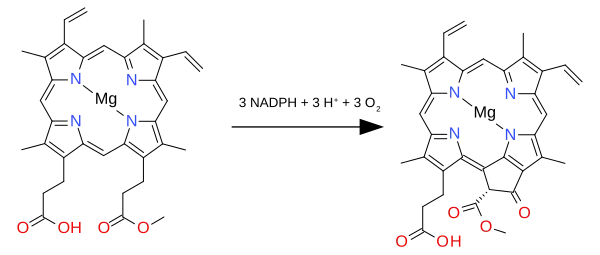 - ↑ Bollivar DW, Beale SI (September 1996). "The Chlorophyll Biosynthetic Enzyme Mg-Protoporphyrin IX Monomethyl Ester (Oxidative) Cyclase (Characterization and Partial Purification from Chlamydomonas reinhardtii and Synechocystis sp. PCC 6803)". Plant Physiology. 112 (1): 105–114. doi:10.1104/pp.112.1.105. PMC 157929. PMID 12226378.