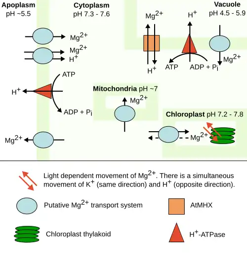 - ↑ Gardner RC (2003). "Genes for magnesium transport". Current Opinion in Plant Biology. 6 (3): 263–267. Bibcode:2003COPB....6..263G. doi:10.1016/S1369-5266(03)00032-3. PMID 12753976.