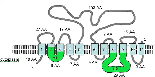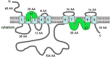 The figure shows the predicted TM topology of XntAp. Adapted from Haynes et al. (2002),[7] this figure shows the computer predicted membrane topology of XntAp in Paramecium. The orientation in the membrane was determined using HMMTOP.[75][76] The TM domains are shown in light blue, the α1 and α2 domains are shown in green. The orientation in the membrane and the positions of the N- and C-termini are indicated and the figure is not drawn to scale.