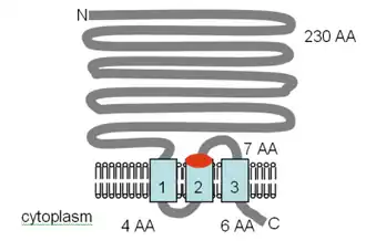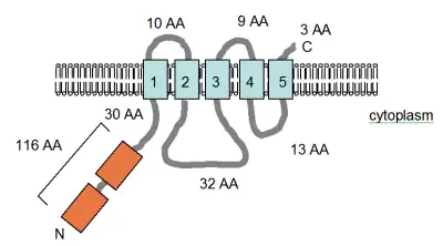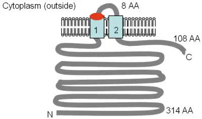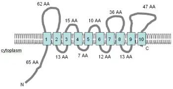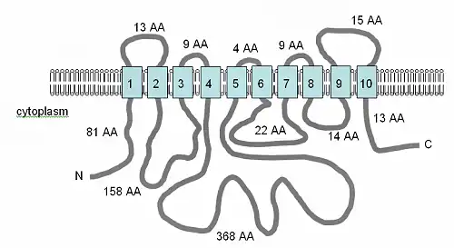 The figure (right), adapted from Smith et al. (1995)[4] and the PFAM database entry, shows the computer-predicted membrane topology of the MgtE protein in Bacillus firmus OF4. The TM domains are shown in light blue. The CBS domains, named for the protein they were identified in, cystathionine-beta synthase, shown in orange, are identified in the Pfam database as regulatory domains, but the mechanism of action has not yet been described. They are found in several voltage-gated chloride channels.[52] The orientation in the membrane and the positions of the N- and C-termini are indicated. This figure is not drawn to scale. This transporter has recently had its structure solved by x-ray crystallography.[53]