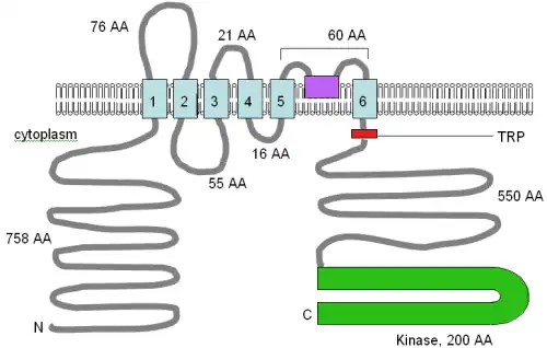 - 1 2 3 Nadler MJ, Hermosura MC, Inabe K, Perraud AL, Zhu Q, Stokes AJ, Kurosaki T, Kinet JP, Penner R, Scharenberg AM, Fleig A (May 2001). "LTRPC7 is a Mg.ATP-regulated divalent cation channel required for cell viability". Nature. 411 (6837): 590–5. Bibcode:2001Natur.411..590N. doi:10.1038/35079092. PMID 11385574. S2CID 4426202.