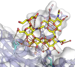- 1 2 3 Stehle T, Harrison SC (February 1996). "Crystal structures of murine polyomavirus in complex with straight-chain and branched-chain sialyloligosaccharide receptor fragments". Structure. 4 (2): 183–94. doi:10.1016/s0969-2126(96)00021-4. PMID 8805524.