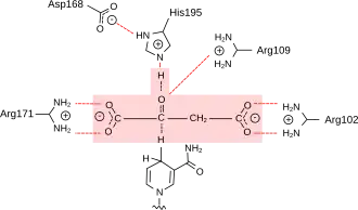 Mechanistically, malate dehydrogenase catalyzes the oxidation of the hydroxyl group of malate by utilizing NAD+ as an electron acceptor. This oxidation step results in the elimination of a proton and a hydride ion from the substrate. NAD+ receives the hydride ion (specifically, the hydride ion is transferred to the nicotinamide ring of the NAD+) and becomes reduced to NADH while concomitantly, the His-195 residue on the enzyme accepts the proton.[11] The positively charged His-195 residue, which is involved in base catalysis of the substrate, is stabilized by the adjacent, negatively charged Asp-168 residue. This electrostatic stabilization helps facilitate the transfer of the proton.[1] Arg-102, Arg-109, and Arg-171 (which are protonated, and thus positively charged) participate in electrostatic catalysis and help to bind the negatively charged carboxylates on the substrate. Additionally, the Arginine residues on the enzyme provide additional substrate specificity and binding through hydrogen bonding between the guanidinium side chain of the Arginine amino acid residues and the carboxylates of the substrate.[12]