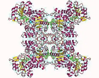 This enzyme belongs to the family of oxidoreductases, to be specific, those acting on the CH-OH group of donor with NAD+ or NADP+ as acceptor. The systematic name of this enzyme class is (S)-malate:NAD+ oxidoreductase (decarboxylating). This enzyme participates in pyruvate metabolism and carbon fixation. NAD-malic enzyme is one of three decarboxylation enzymes used in the inorganic carbon concentrating mechanisms of C4 and CAM plants. The others are NADP-malic enzyme and PEP carboxykinase.[1][2]