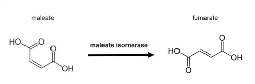 In enzymology, a maleate isomerase (EC 5.2.1.1), or maleate cis-tran isomerase, is a member of the Asp/Glu racemase superfamily discovered in bacteria. It is responsible for catalyzing cis-trans isomerization of the C2-C3 double bond in maleate to produce fumarate,[1] which is a critical intermediate in citric acid cycle.[2] The presence of an exogenous mercaptan is required for catalysis to happen.[3]