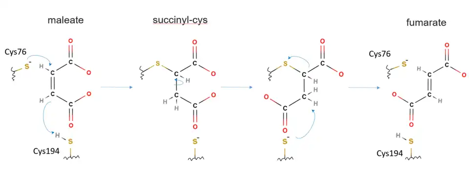 The mechanism of maleate isomerase is considered to be similar to other Asp/Glu racemase members, though have not been fully understood. One proposed reaction mechanism of Nocardia farcinia maleate isomerase is as follows.[1][9] At the active site of maleate isomerase, Cys76 is first deprotonated to be more readily act as a nucleophile.[1] The sulfur atom of the deprotonated Cys76 then carries a direct nucleophilic attack to the C2 atom of the maleate, covalently bonding to the C2 atom.[9][1] Concomitantly, thiol proton of Cys194 is transferred onto the C3 atom of the maleate to form a succinyl-cysteine intermediate.[9][1] The newly formed C2–C3 single bond is then rotated, with Cys76S–C2 bond dissociated, and C3 atom of the maleate deprotonated by Cys194, thus forming fumarate with regeneration of a neutral Cys194.[9][1] In certain type of bacteria, maleate seems completely buried inside the cavity of maleate isomerase and cannot be seen on the surface of the enzyme.[5]