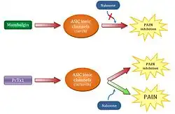 - 1 2 Salinas M, Besson T, Delettre Q, Diochot S, Boulakirba S, Douguet D, Lingueglia E (May 2014). "Binding site and inhibitory mechanism of the mambalgin-2 pain-relieving peptide on acid-sensing ion channel 1a". The Journal of Biological Chemistry. 289 (19): 13363–13373. doi:10.1074/jbc.m114.561076. PMC 4036345. PMID 24695733.