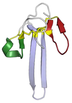 ![]() The structure of mambalgin-1, showing the three "finger" loops in red (loop I), blue (loop II), and green (loop III), with core disulfide bonds highlighted in yellow.[1] | |||||||