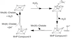 MnP catalysis occurs in a series of irreversible oxidation-reduction (redox) reactions which follow a ping-pong mechanism with second order kinetics.[4] In the first step of the catalytic cycle, H2O2, or an organic peroxide, enters the active site of MnP. There the oxygen in H2O2 binds to an Fe(III) ion in the heme cofactor to form an iron peroxide complex. Two electrons are transferred from Fe3+ to peroxide, breaking the oxygen-peroxide bond to form H2O and a Fe(IV) oxo-porphyrin radical complex. This oxidized intermediate is known as MnP Compound I. MnP Compound I then binds to a monochelated Mn(II) ion, which donates an electron to quench the radical and form Mn(III) and MnP Compound II, a Fe(IV) oxo-porphyrin complex. MnP Compound II oxidizes another Mn(II) ion to Mn(III) and is reduced by the reaction of two H+ ions and the iron bound oxygen. This reforms the Fe(III) ion in the heme and releases a second water molecule.[5] There are many deviations from this traditional catalytic cycle. MnP Compound I can be used to oxidize free Mn(II), ferrocyanide, as well as phenolics, and other aromatic compounds.[6]