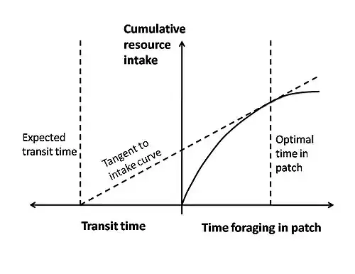 As animals forage in patchy systems, they balance resource intake, traveling time, and foraging time. Resource intake within a patch diminishes with time, as shown by the solid curve in the graph to the right. The curve follows this pattern because resource intake is initially very fast, but slows as the resource is depleted. Traveling time is shown by the distance from the leftmost vertical dotted line to the y-axis. Optimal foraging time is modeled by connecting this point on the x-axis tangentially to the resource intake curve. Doing so maximizes the ratio between resource intake and time spent foraging and traveling.