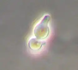 Cryptococcus neoformans is a basidiomycetous fungus that grows as a budding yeast in culture and infected hosts. C. neoformans causes life-threatening meningoencephalitis in immunocompromised patients. It undergoes a filamentous transition during the sexual cycle to produce spores, the suspected infectious agent. The vast majority of environmental and clinical isolates of C. neoformans are of mating type α. Filaments ordinarily have haploid nuclei, but these can undergo a process of diploidization (perhaps by endoreduplication or stimulated nuclear fusion) to form diploid cells termed blastospores.[74]