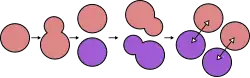 Yeast cells can stably exist in either a diploid or a haploid form. Both haploid and diploid yeast cells reproduce by mitosis, in which daughter cells bud from mother cells. Haploid cells are capable of mating with other haploid cells of the opposite mating type (an a cell can only mate with an α cell and vice versa) to produce a stable diploid cell. Diploid cells, usually upon facing stressful conditions like nutrient depletion, can undergo meiosis to produce four haploid spores: two a spores and two α spores.[1][2]