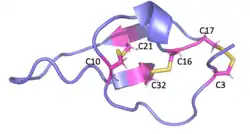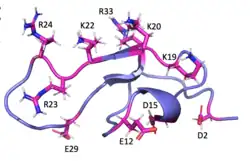 MCa folds folds into the inhibitor cystine knot motif. The structure consists of a compact disulfide-bond core with the following three pairs: Cys3-Cys17, Cys10-Cys21, and Cys16-Cys32 (Fig. 1).[1] Another important feature of MCa is the dipole moment which exists because of the basic-rich surface including the residues Lys19, Lys20, Lys22, Arg23, Arg24, and Arg3 without any acidic residue. Compared to the opposite surface contains four acidic residues Asp2, Glu12, Asp15, and Glu29 (Fig. 2).[2] This dipole moment is proposed to help it cross the membrane. The only element of regular secondary structure is a double-stranded antiparallel b-sheet comprising residues 20–23 and 30–33.[2]
