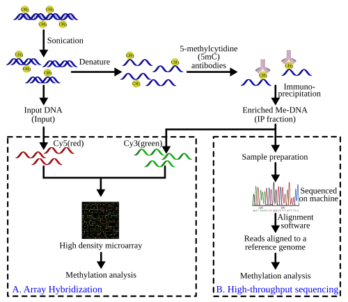 The following sections outline the method of MeDIP coupled with either high-resolution array hybridization or high-throughput sequencing. Each DNA detection method will also briefly describe post-laboratory processing and analysis. Different post-processing of the raw data is required depending on the technology used to identify the methylated sequences. This is analogous to data generated using ChIP-chip and ChIP-seq.