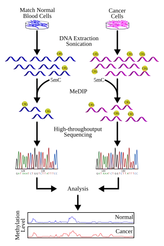 Methylated DNA immunoprecipitation (MeDIP or mDIP) is a large-scale (chromosome- or genome-wide) purification technique in molecular biology that is used to enrich for methylated DNA sequences. It consists of isolating methylated DNA fragments via an antibody raised against 5-methylcytosine (5mC). This technique was first described by Weber M. et al.[1] in 2005 and has helped pave the way for viable methylome-level assessment efforts, as the purified fraction of methylated DNA can be input to high-throughput DNA detection methods such as high-resolution DNA microarrays (MeDIP-chip) or next-generation sequencing (MeDIP-seq). Nonetheless, understanding of the methylome remains rudimentary; its study is complicated by the fact that, like other epigenetic properties, patterns vary from cell-type to cell-type.