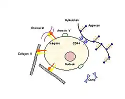 - ↑ Kurtis, Melissa S.; Tu, Buu P.; Gaya, Omar A.; Mollenhauer, Jürgen; Knudson, Warren; Loeser, Richard F.; Knudson, Cheryl B.; Sah, Robert L. (2001). "Mechanisms of chondrocyte adhesion to cartilage: Role of β1-integrins, CD44, and annexin V". Journal of Orthopaedic Research. 19 (6): 1122–30. doi:10.1016/S0736-0266(01)00051-1. PMID 11781014.