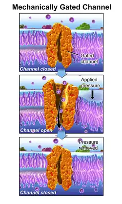 In this process, a mechanically gated ion channel makes it possible for sound, pressure, or movement to cause a change in the excitability of specialized sensory cells and sensory neurons.[9] The stimulation of a mechanoreceptor causes mechanically sensitive ion channels to open and produce a transduction current that changes the membrane potential of the cell.[10] Typically the mechanical stimulus gets filtered in the conveying medium before reaching the site of mechanotransduction.[11] Cellular responses to mechanotransduction are variable and give rise to a variety of changes and sensations. Broader issues involved include molecular biomechanics.