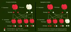 | Law of dominance and uniformity | Some alleles are dominant while others are recessive; an organism with at least one dominant allele will display the effect of the dominant allele.[27] |