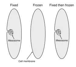 These models were called into question during the late 1970s when data accumulated suggesting that mesosomes are artifacts formed through damage to the membrane during the process of chemical fixation, and do not occur in cells that have not been chemically fixed.[2][7][8] By the mid to late 1980s, with advances in cryofixation and freeze substitution methods for electron microscopy, it was generally concluded that mesosomes do not exist in living cells.[9][10][11] However, a few researchers continue to argue that the evidence remains inconclusive, and that mesosomes might not be artifacts in all cases.[12][13]