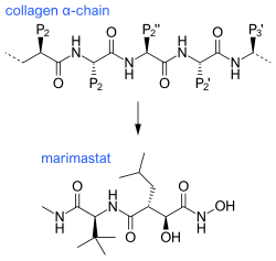 The first generation of MMP inhibitors were based on the structure of the collagen molecule. In the design of these inhibitors, the basic protein backbone of collagen is maintained but the amide bond is replaced with a zinc-binding group.[11] This group of inhibitors contain a hydroxamate (-CONHOH) group that binds the zinc atom in the active site of the MMP enzyme, therefore this group is called "hydroxamate-based MMP inhibitors“.[6] An example can be seen in Marimastat, a first generation inhibitor, which has a similar backbone and sidechain format to collagen.
