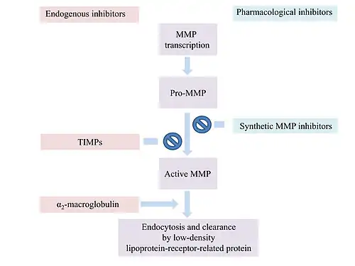 MMP activity is regulated at various levels for example by endogenous inhibitors like α2-macroglobulin and the tissue inhibitors of metalloproteinases (TIMPs).[18]
