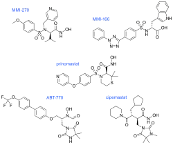 In MMI-270 there is also an amino acid sidechain-type substituent on the carbon that is α to the hydroxamate, along with a sidechain on the sulfonamide (which was later shown to be unnecessary). The N-arylsulfonyl-α-aminoacid hydroxamate of MMI-270 mimics the marimastat succinate motif. Cipemastat, which was developed as an MMP-1, -3 and -9 collagenase inhibitor for the treatment of rheumatoid- and osteo-arthritis, also has the marimastat succinate motif. Its clinical trial was terminated prematurely.